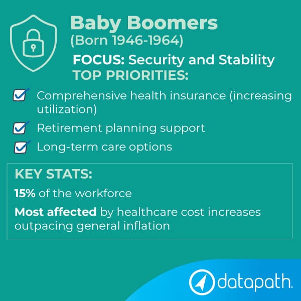 Boomers are known for their strong work ethic and dedication to career growth. They prefer face-to-face communication and traditional management styles. After years of working and saving, they now face the challenge of funding a long retirement, especially with rising healthcare costs. Top priorities include comprehensive health insurance, solid retirement planning, and long-term care options. Job security and established benefits are also very important.