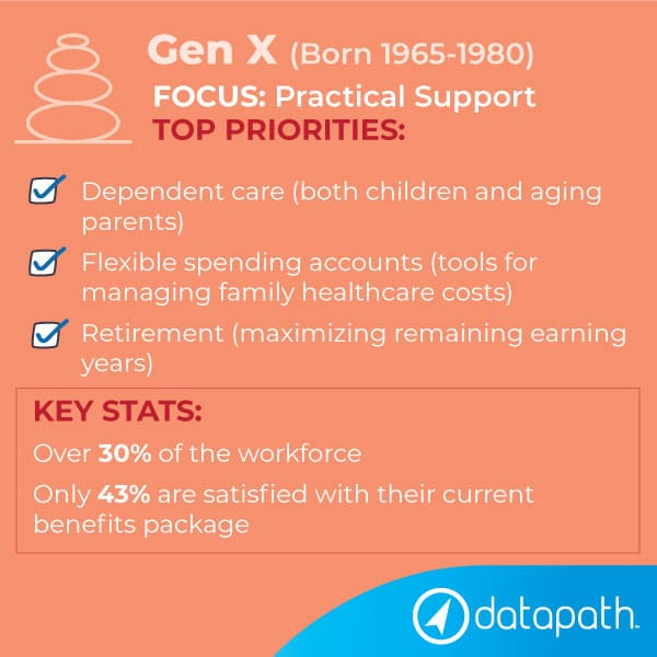 Generation X, now in their 40s and 50s, are the “sandwich generation” and find themselves caring for aging parents while also supporting their own children. This dual role creates financial and time pressures that shape their benefits priorities. Having seen corporate downsizing, multiple recessions, and the decline of traditional pensions, Gen X approaches workplace promises with skepticism. They prefer practical, proven benefits over flashy perks.