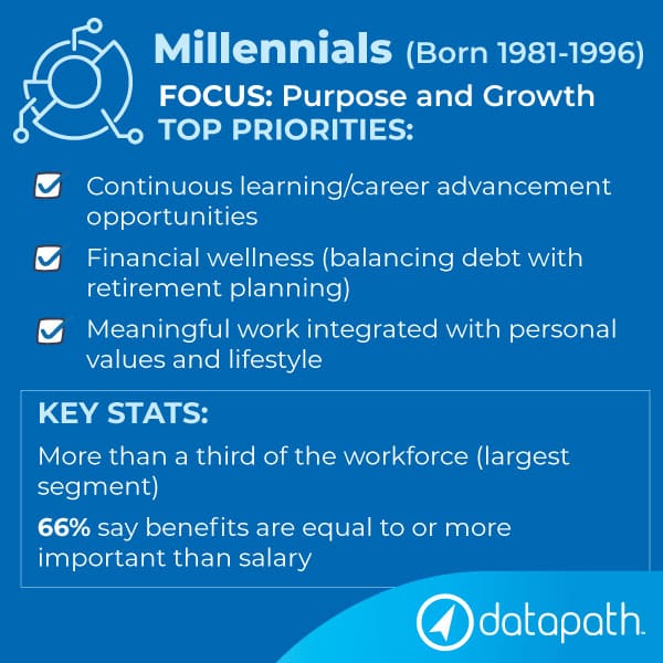 Millennials seek purpose and values in their jobs. Digital integration and meaningful work are key. Instead of traditional work-life balance, they want careers that align with their values and offer flexibility. Top priorities include professional growth, social impact, and fair pay with benefits. Financial wellness programs are essential for managing student loan debt, saving for a home, and planning for retirement.