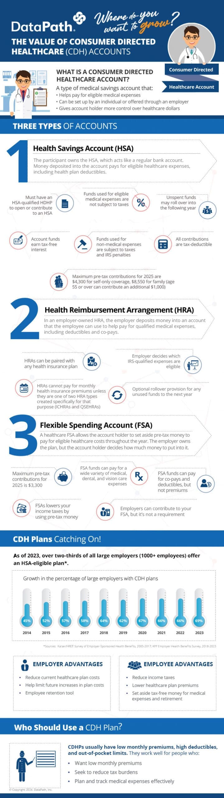 View the infographic below to discover the value of consumer-directed healthcare accounts. The graphic features an overview of HSAs, HRAs, and FSAs, along with other helpful information.